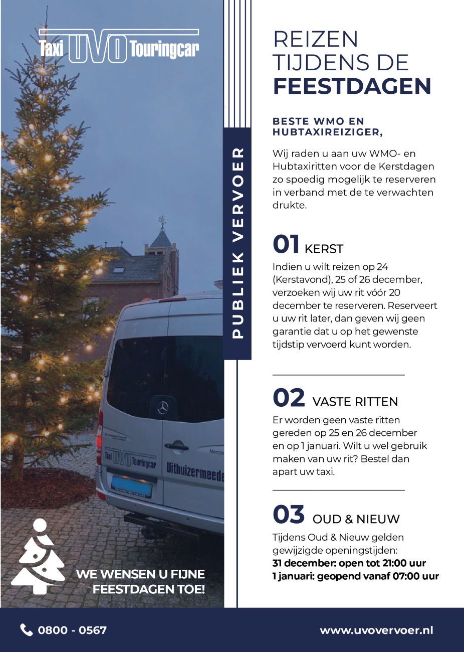 Voor verdere informatie en voor het reserveren van een rit tijdens de feestdagen bekijk onderstaande flyers of neem contact op met uw vervoerder.